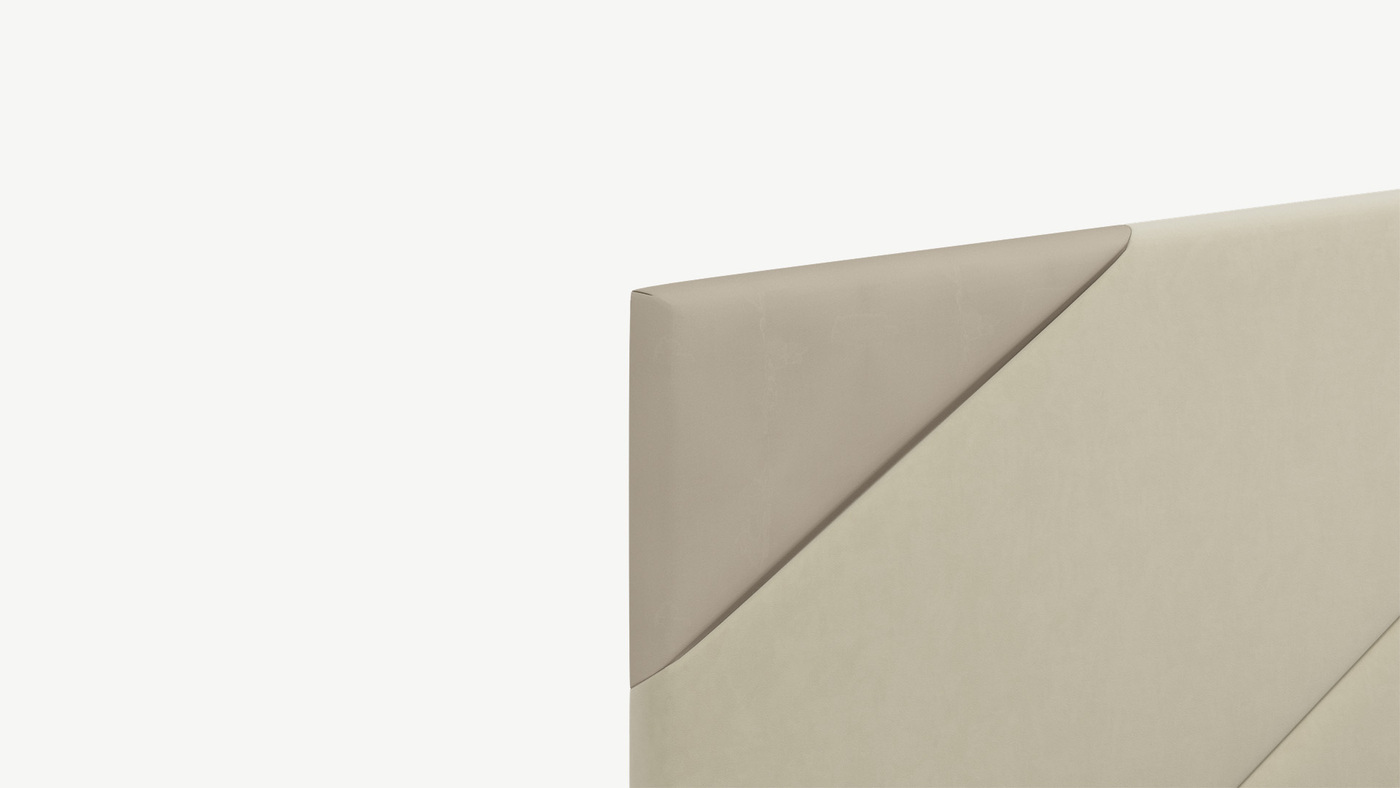 MOON FAMILY 1257 привлекает внимание оригинальным исполнением: широкие полосы ткани эффектно пересекают периметр изголовья, создавая на нем графический орнамент. Элегантным и практичным акцентом служат скрытые карманы, расположенные по его углам. Лаконичные формы объемных царг создают единый гармоничный образ и фокусируют внимание на центральном текстурном элементе кровати.